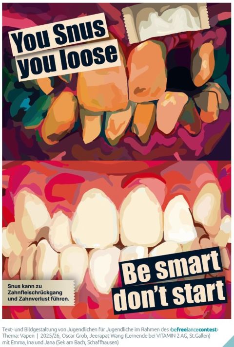 Poster zum Thema Snus, gestaltet von Schülerinnen und Schülern aus der kommenden befreelance Jugendagenda 2026/2027.
